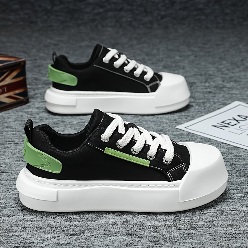Men'S Summer Casual Low-Top Sneakers - Black & White with Green Accents, Breathable Fabric Lining, Durable Faux Sole, Lace-Up Round Toe Design for Casual Attire, Streetwear Shoes | Trendy Casual Shoes | Comfortable Footwear
