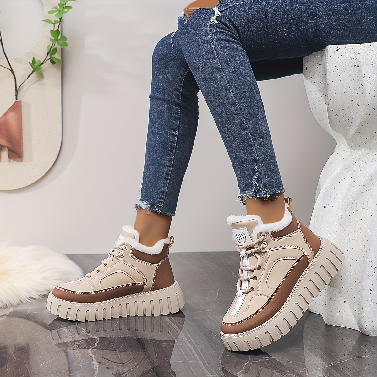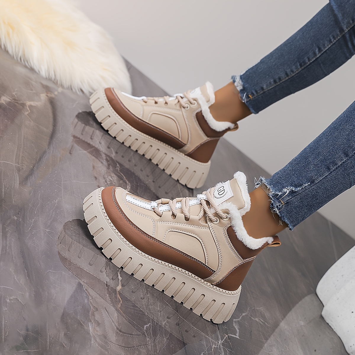 Women'S High-Top Winter Snow Boots with Thick Cushioned EVA Sole & Lace-Up Closure - PU Upper, Breathable Fabric Lining, Beige/White Casual Shoes for Casual Attire, Snowy Weather Footwear, Secure Laceup Footwear
